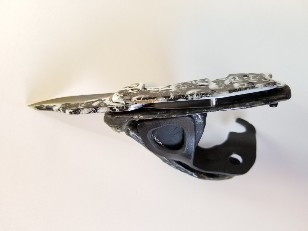 I made another version using a better, smaller knife and a carbon fiber bridge to attach to my orthosis. And when a friend offered to let me try out their hydro dipping kit, naturally this was the first device that came to mind!