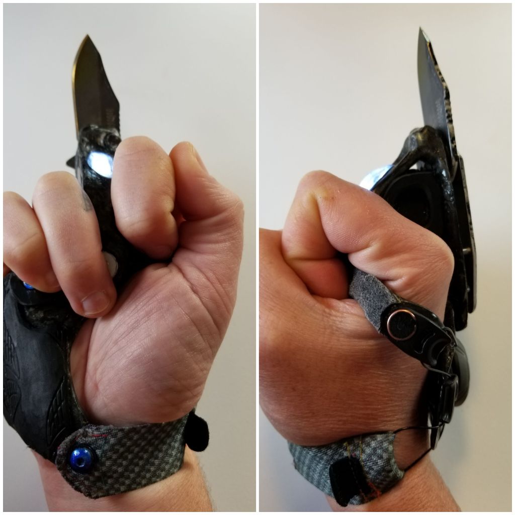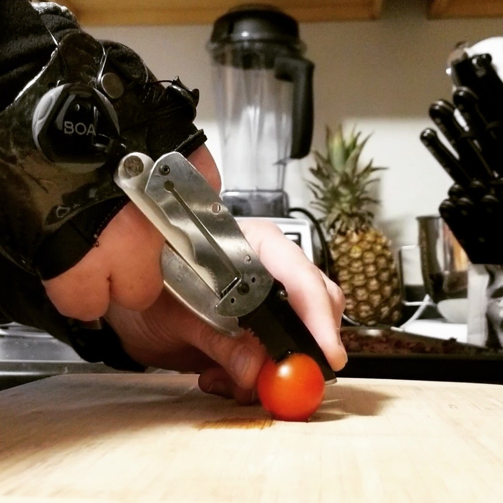 I made my prototype Knifinger using a cheap pocketknife and some aluminum bar stock that I attached to my trusty carbon fiber plalmar orthosis (originally designed for my palmar hook). I’d had to cut the blade shorter to fit so it was too dull to cut well, but the concept showed promise. After all, I could cut things and express myself with the same device!